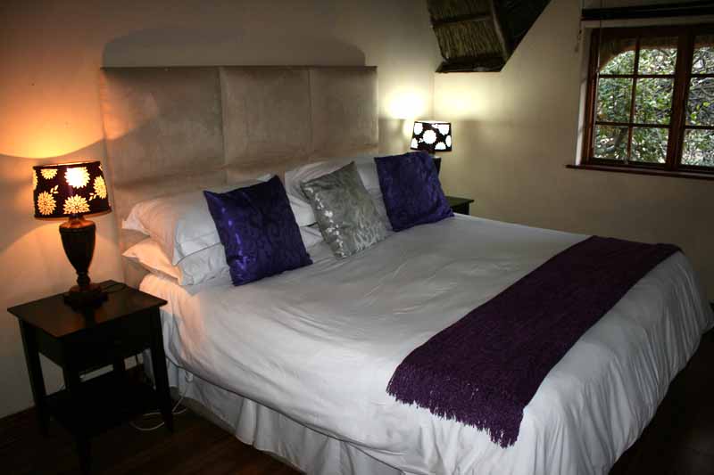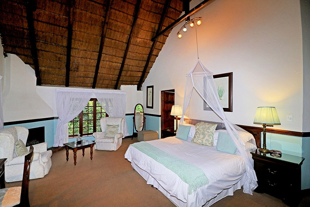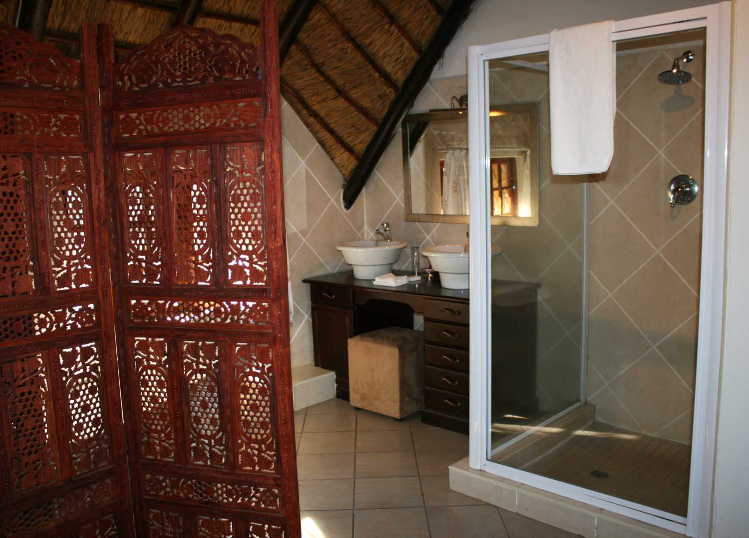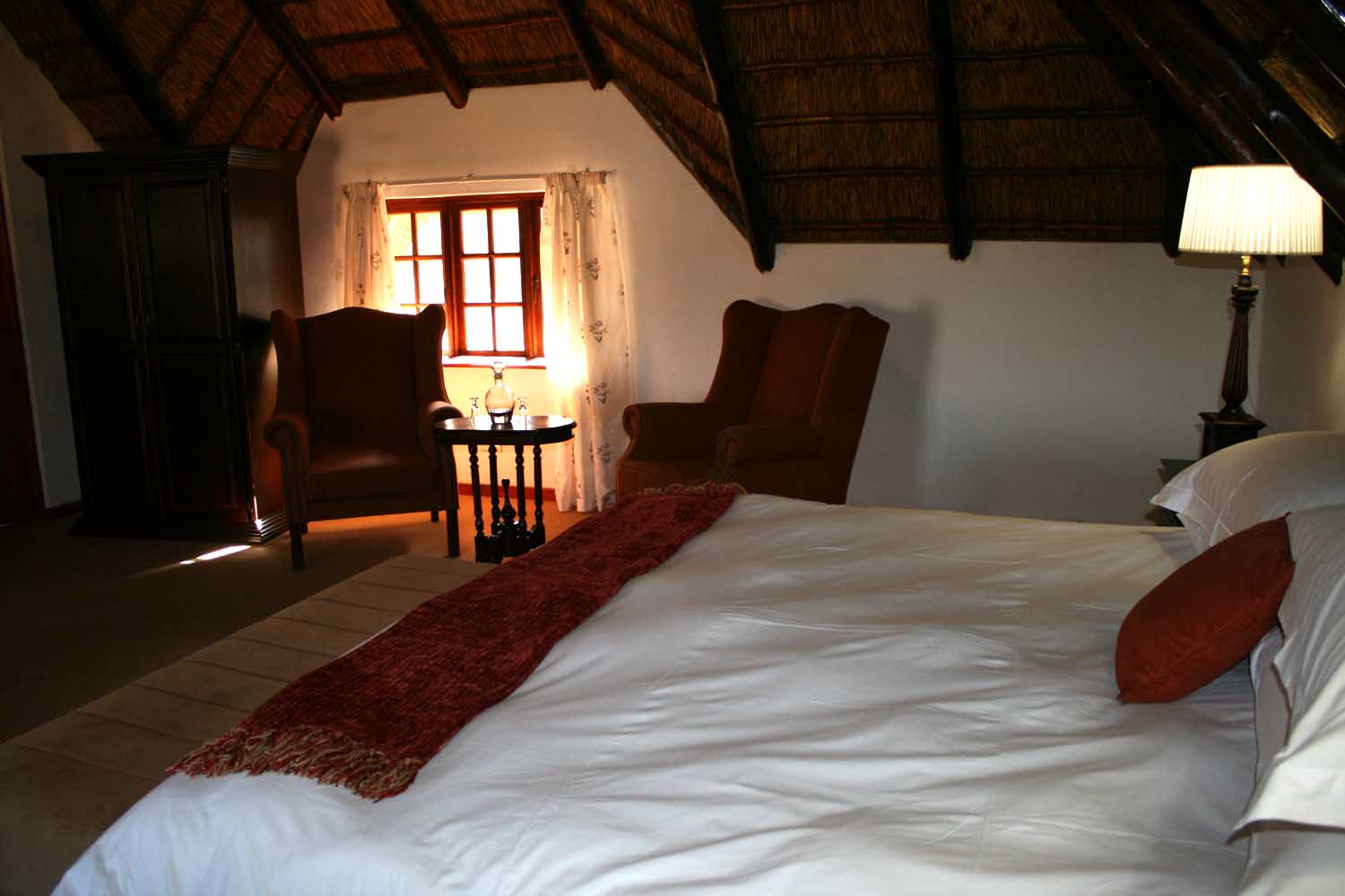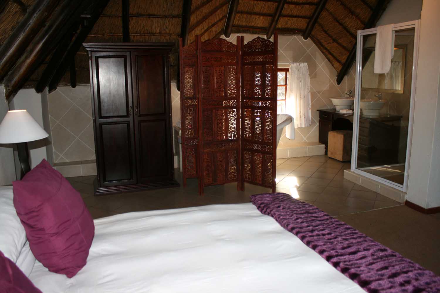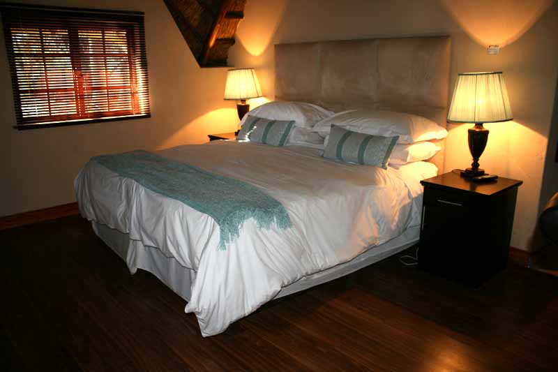 Pretty and serene, this deluxe suite is decorated in cream and soft sky blue. It has a full bathroom, with a lovely corner bath and shower. The thatch roof and airconditioning keep this suite cool and fresh in summer, and the underfloor heating and electric blankets ensure it’s snug and warm in winter.