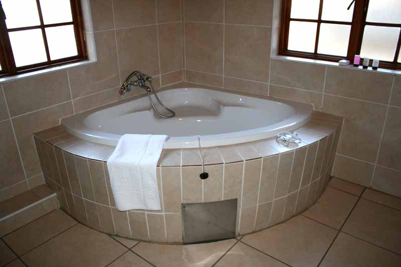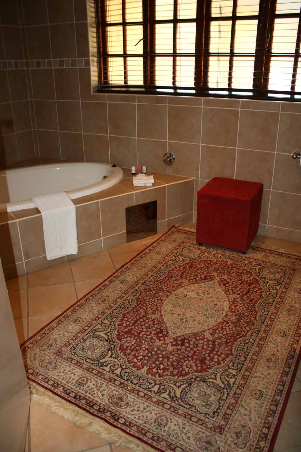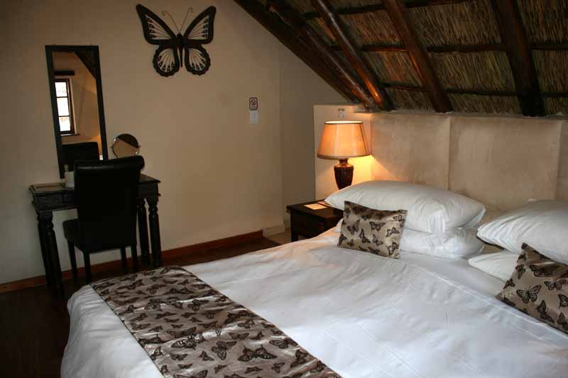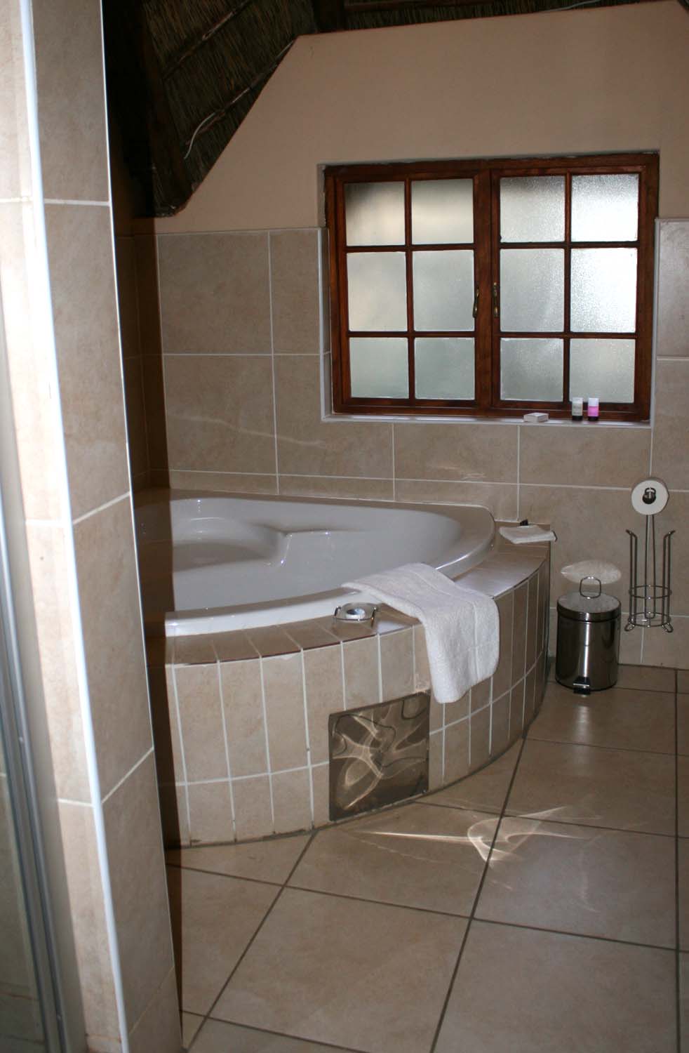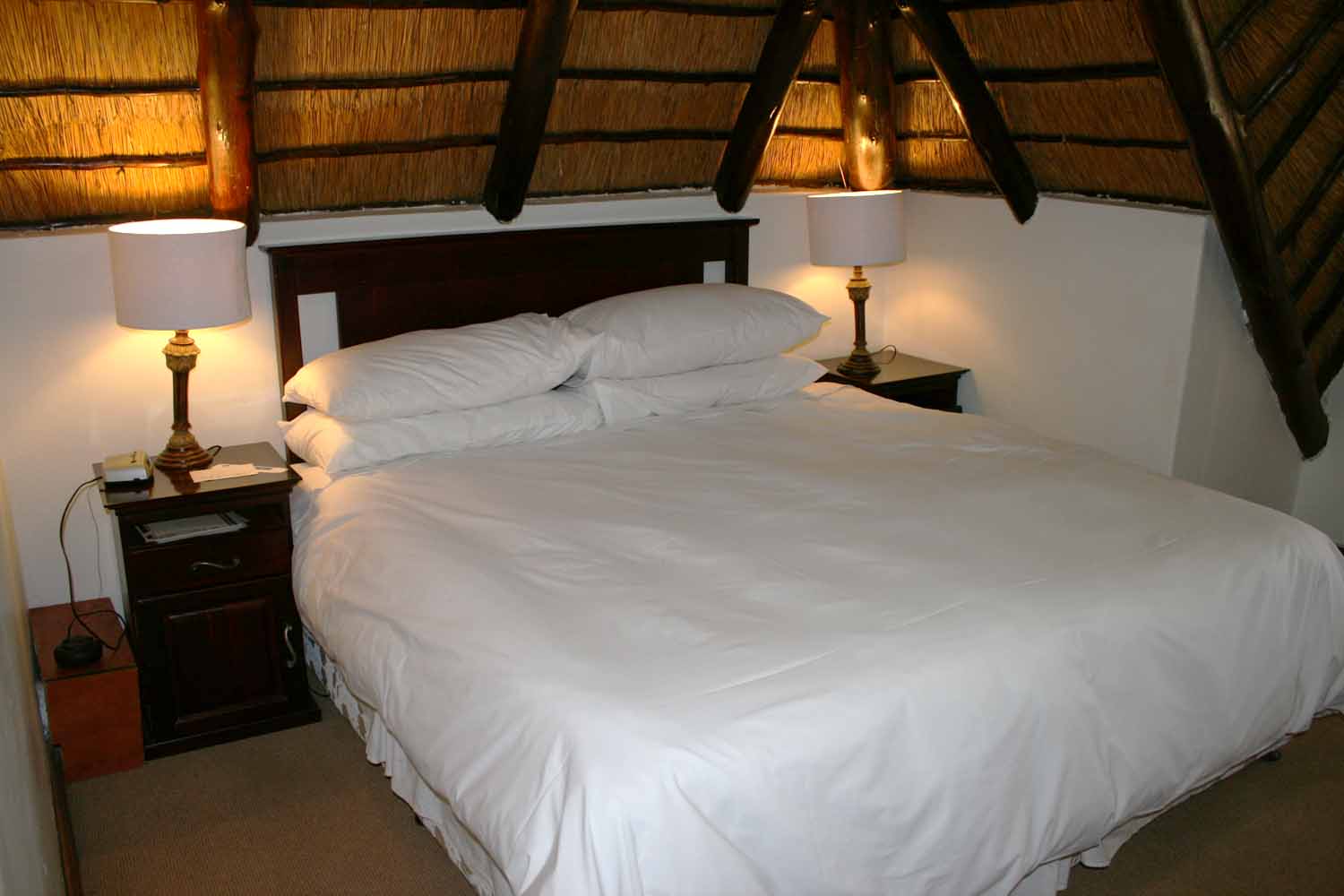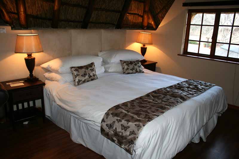 Pretty and serene, this deluxe suite is decorated in cream and soft sky blue. It has a full bathroom, with a lovely corner bath and shower. The thatch roof and airconditioning keep this suite cool and fresh in summer, and the underfloor heating and electric blankets ensure it’s snug and warm in winter.