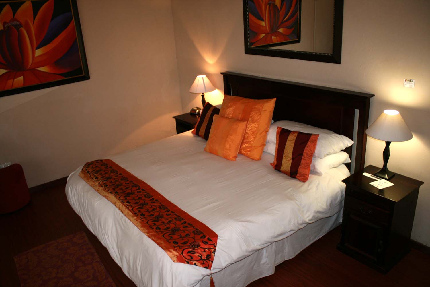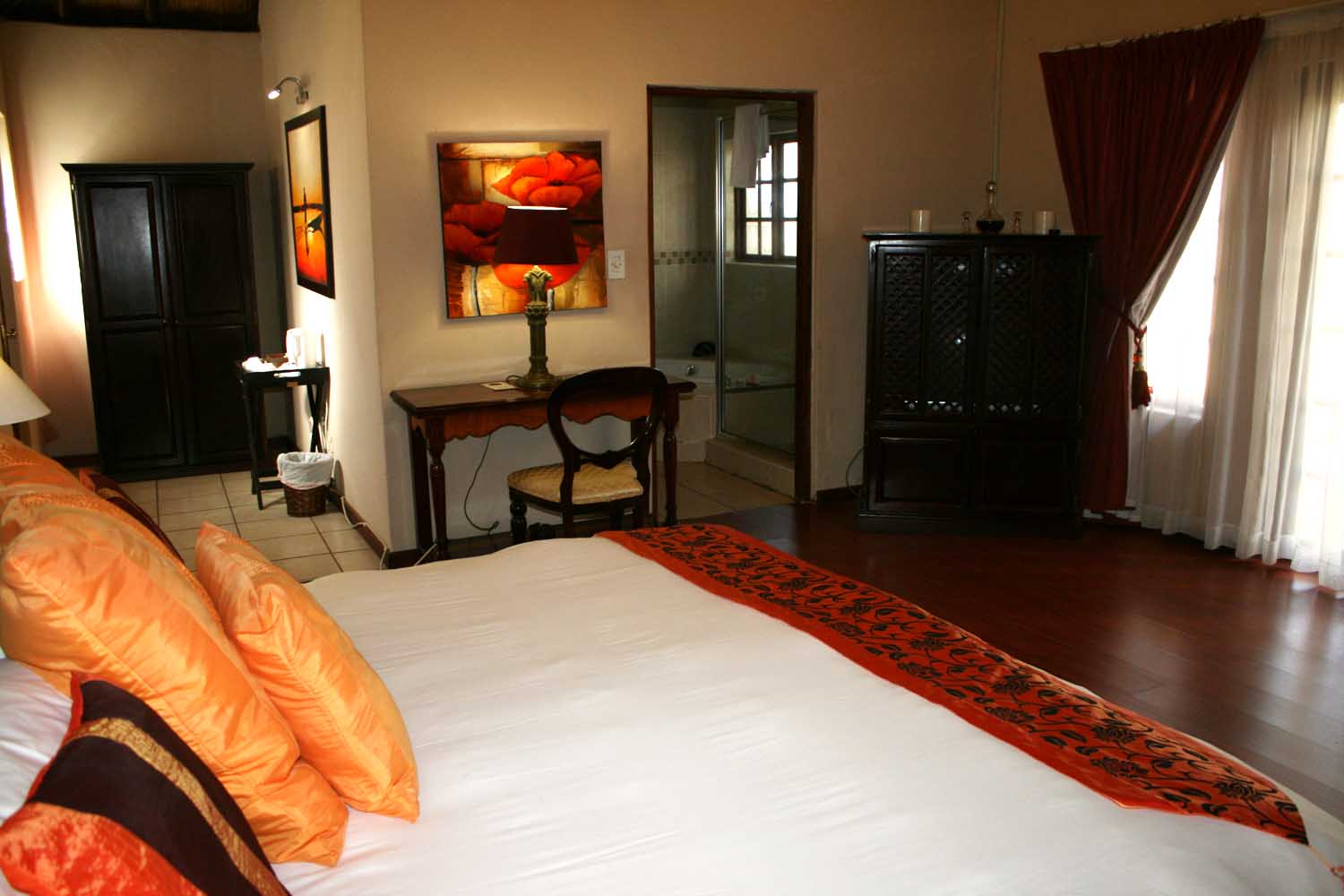 Elegance itself is the best way to describe this suite with French doors that open up on to a private patio, overlooking the lush treed garden. Decorated in cream and rich rusty tones, this suite exudes a feeling of royal elegance. The modern en-suite bathroom has a shower and oval bath as well as twin basins. This suite has under-floor heating, air conditioning and a fan.
